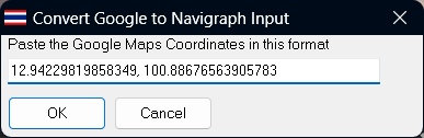 This little application will take a Google Maps formatted set of coordinates and convert them to the format used by Navigraph Charts.